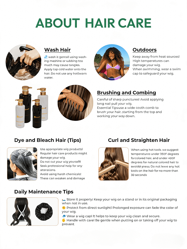Wash weekly with sulfate-free shampoo, air-dry, and use a wide-tooth comb. Avoid high heat (Natural-colored human hair 356°F-392°F; Colored human hair 320°F-356°F) and store on a wig stand. Regular conditioning prevents tangling and extends lifespan