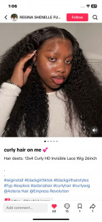 T*****Y’all this wig is probably the best curly wig I’ve brought! I got lots of compliments on it and the lace comes pre plucked and it’s HD! I didn’t do any work on it I just slapped it on and styled it. I will now be buying all my hair from Asteria. The quality is definitely there! I had this wig for about 2 ish weeks now and I’ve been wearing it to sleep and for a whole week. I don’t get that much shedding but it is curly hair so don’t expect it not to shed. If you have any more questions y’all can hit me on the gram :) (@_enutpen) and the customer service is a 10/10