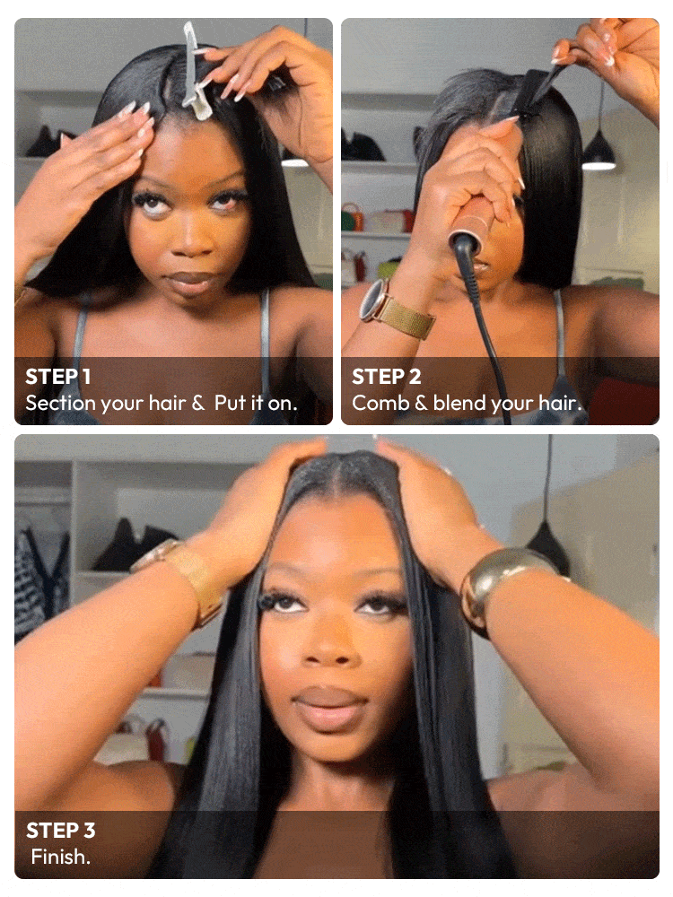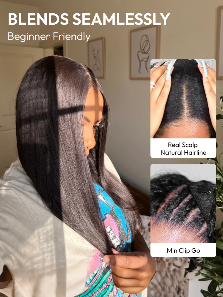 • This 250% density Light Yaki Straight wig is available in V Part and U Part styles. Made with 100% glueless human hair, it blends naturally with relaxed textures. No lace, no mess – beginner-friendly and ready to wear.