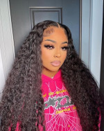 The second raw model wears a 28inch 250 density curly 13x4 HD lace front wig, it's a middle part curly wig hairstyle.