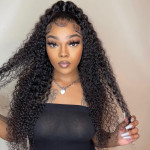 This item is a long curly human hair wig, pre-plucked natural hairline, baby hair premade, natural black hair color. Long curly wigs have 180% density and 250% density, as curly hair is a kind of big hair, 180% density is popular, but if you prefer big hair, 250% density would be your best choice.