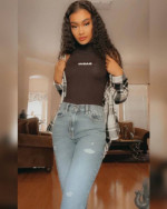 The third model(5'9) with jacket has a side part hairstyle, the hair details: 26inch 180% density curly human hair 13x4 HD lace front wig.